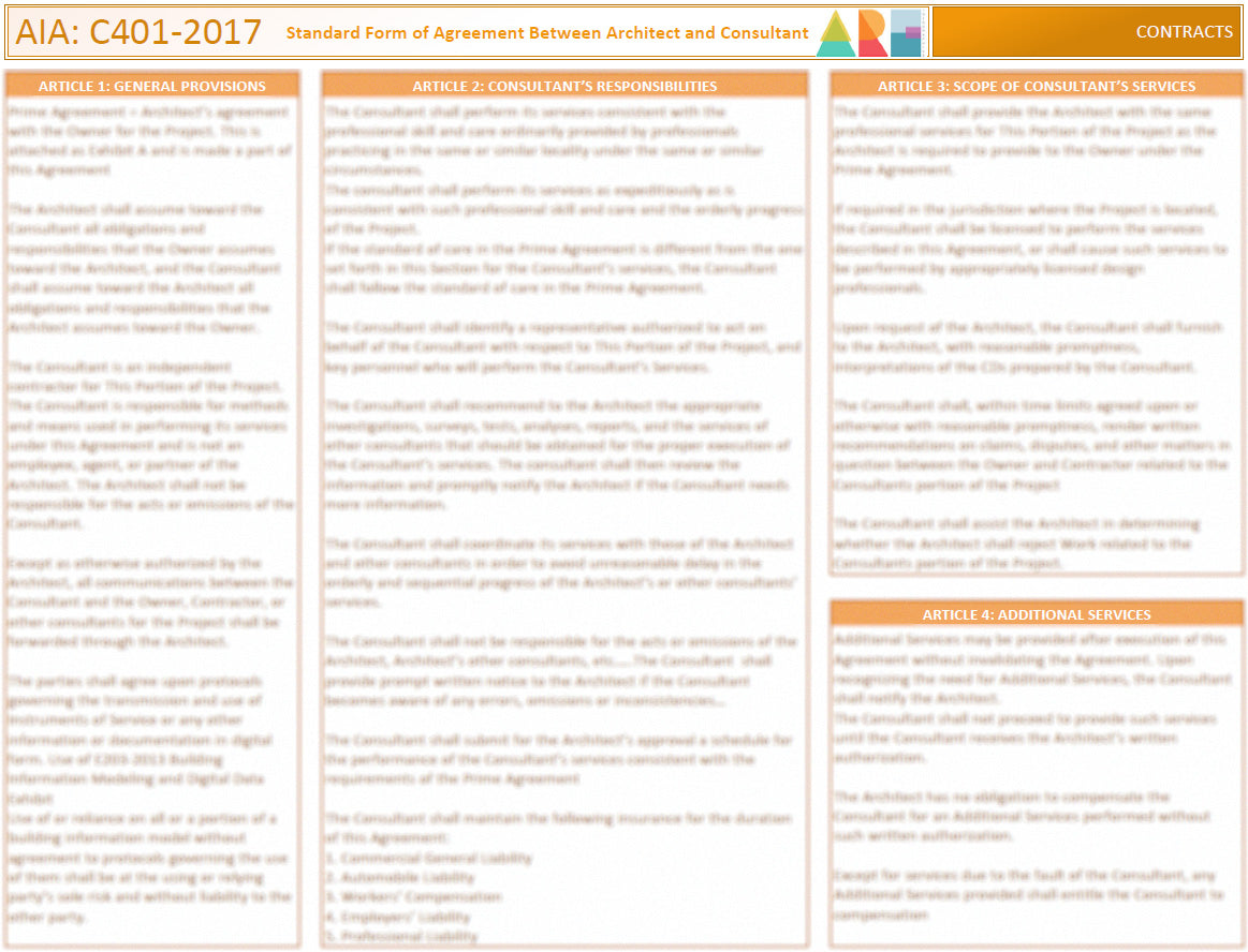 Four sheets of condensed information using AIA C401_2017. This document is intended to be used as a supplemental study aid material to the actual AIA document. It is best to use this document as a review and a "cheat sheet".